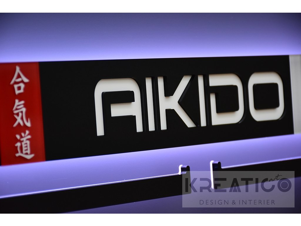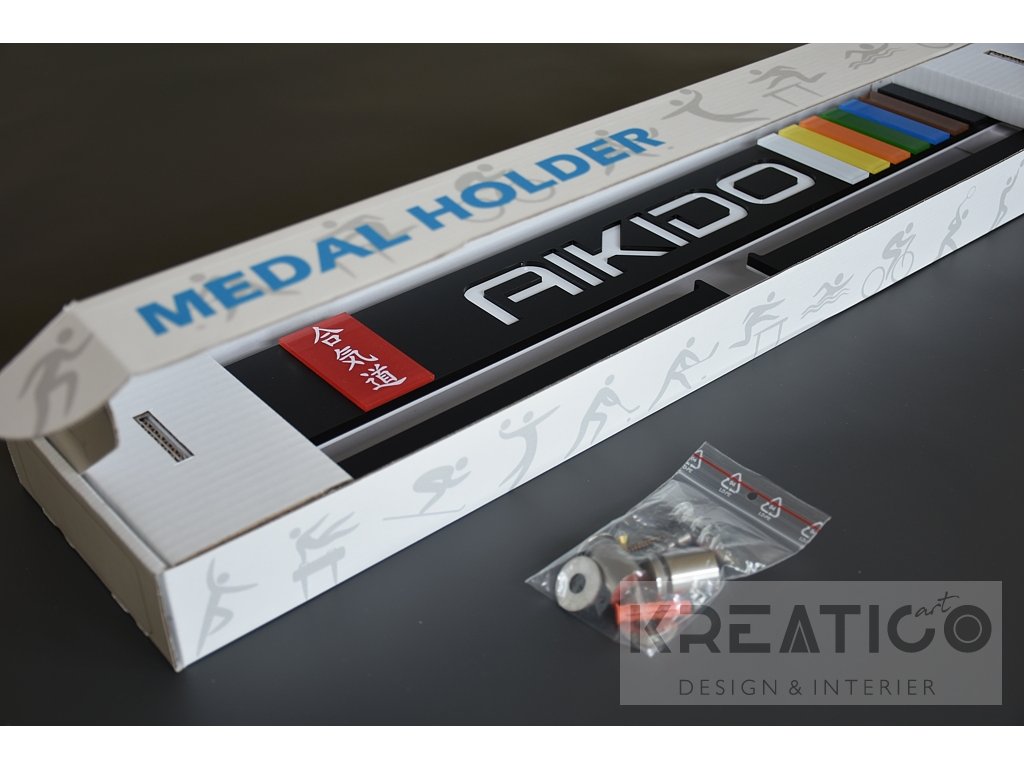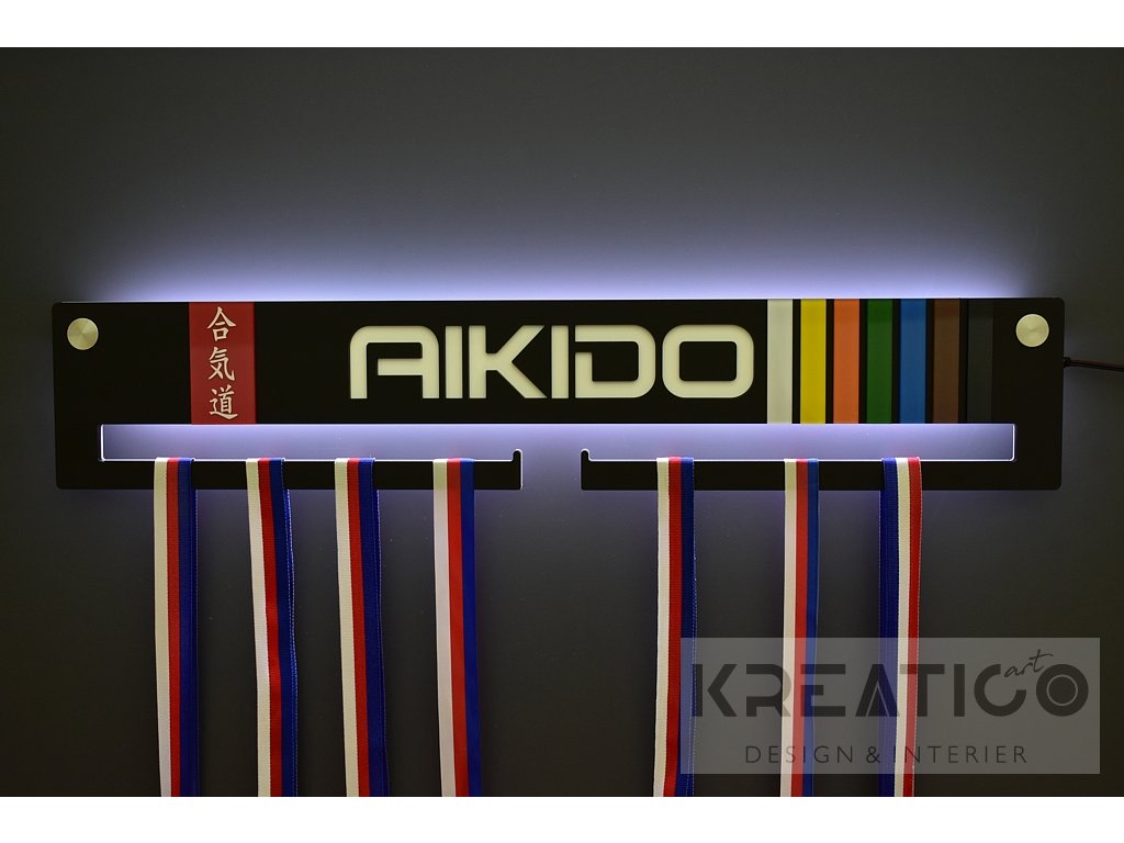 Podsvětlený držák medailí na zeď určený pro všechny příznivce aikida k prezentaci dosažených výsledků. Předností navrženého držáku je barevné RGB LED podsvětlení, tématické barvy a detaily odkazující na vybraný sport. Každý z nás má řadu medailí a ocenění, které si rád vystaví.